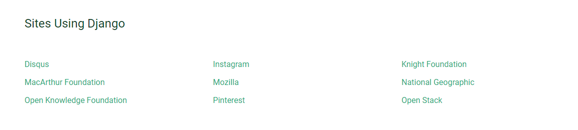 Django가 적용된 대표적인 서비스는 인스타그램, 모질라, 핀터레스트 등이 있습니다.
